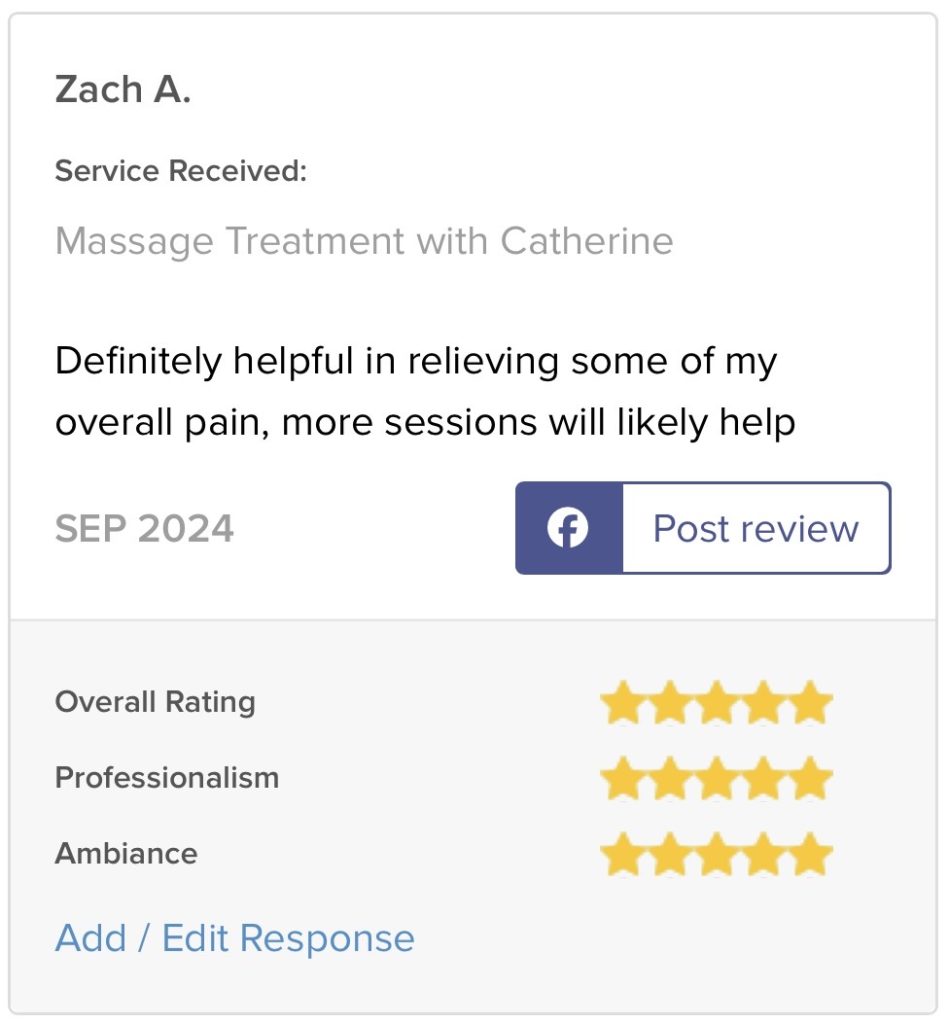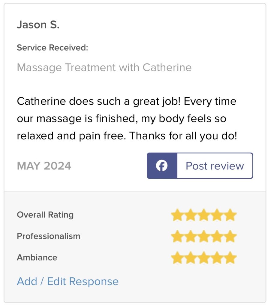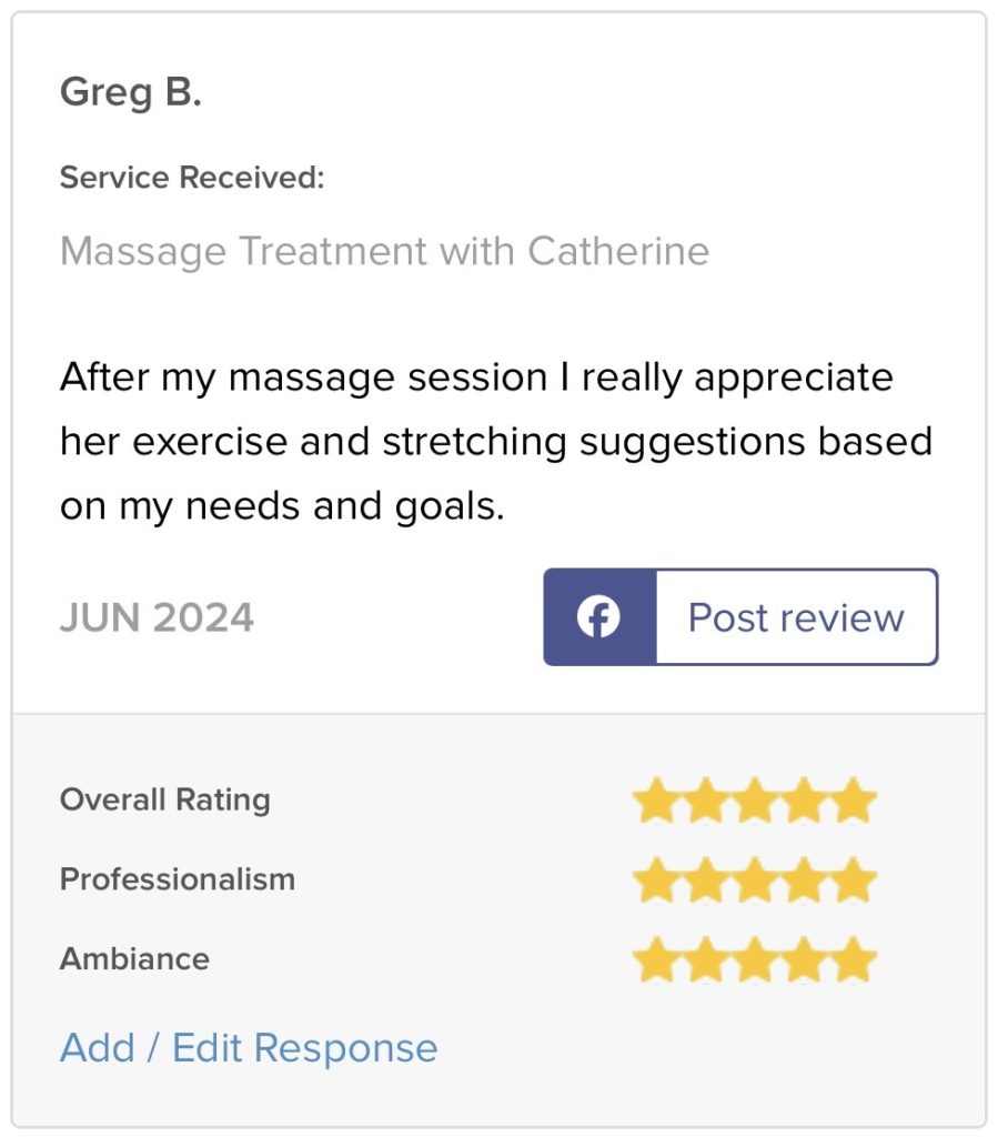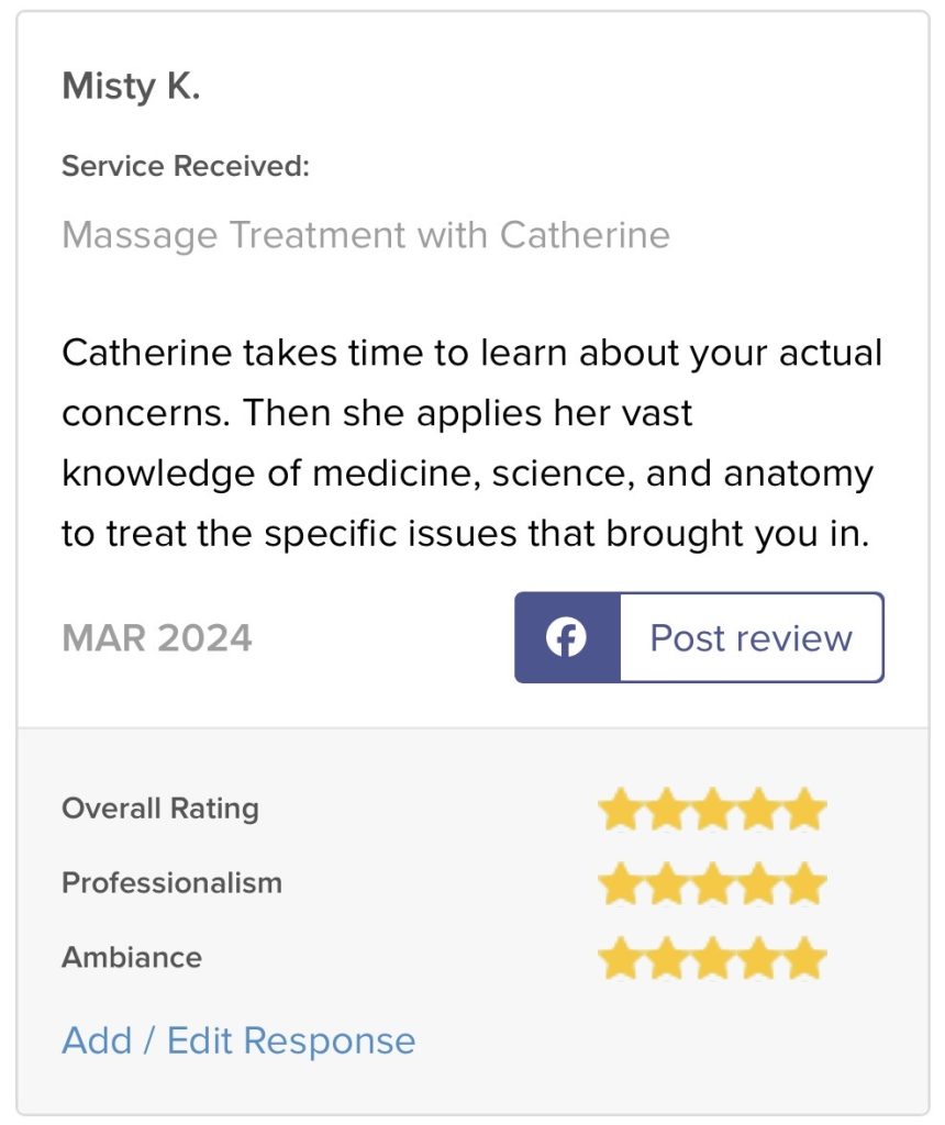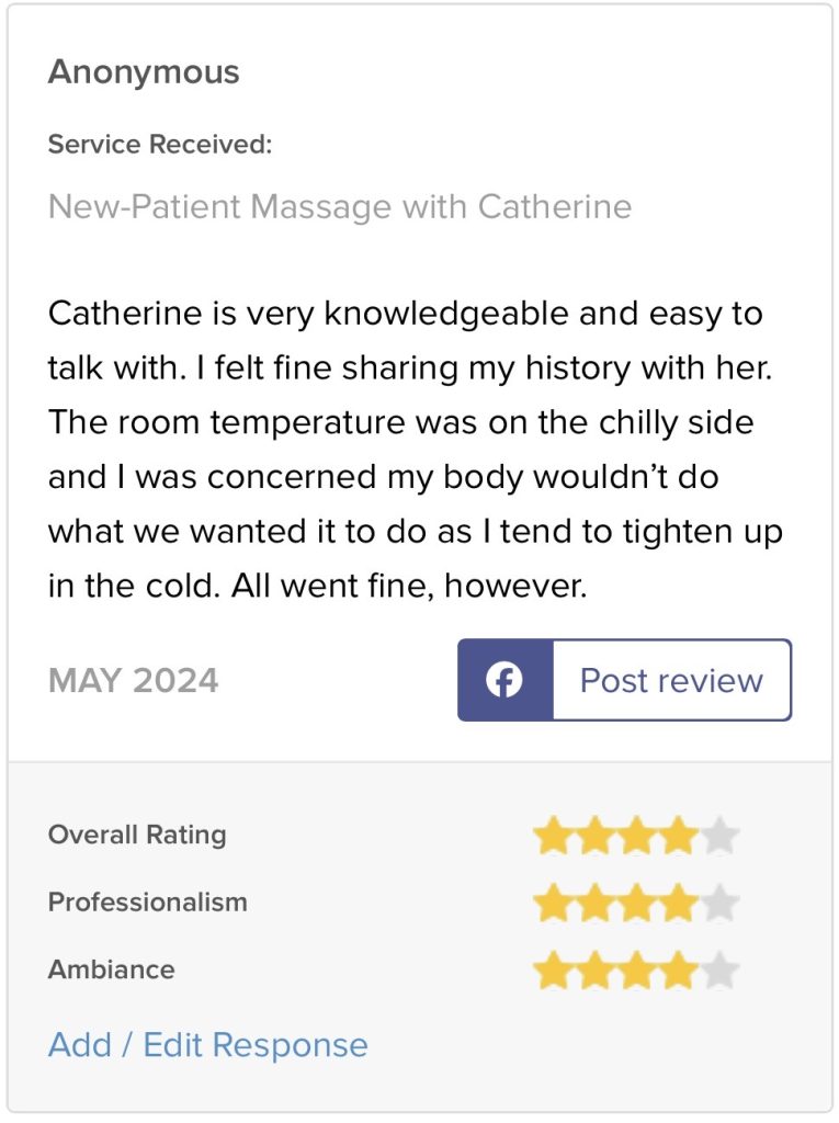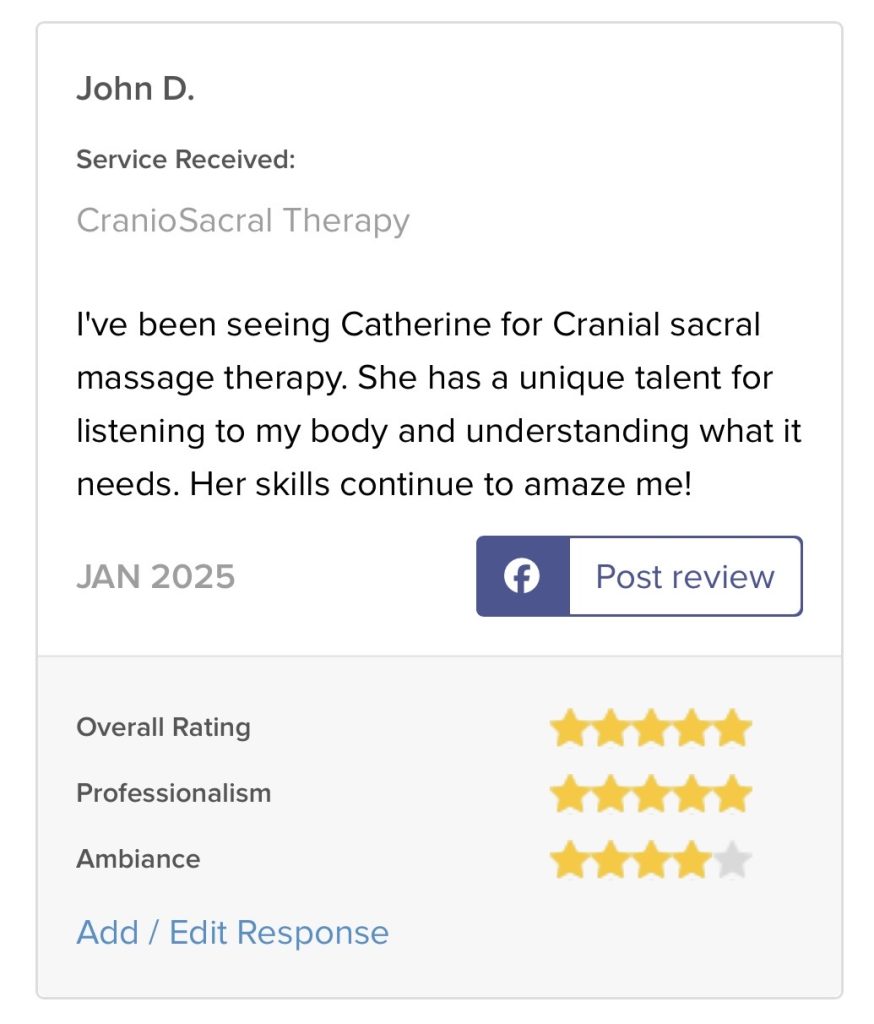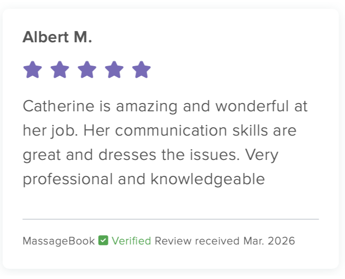 Reviews See what Catherine’s patients are saying Catherine’s Services, Rates, and Location Does Insurance Pay for Massage Therapy? Questions about CranioSacral Therapy See all reviews on MassageBook See all reviews on Google See all reviews on Facebook